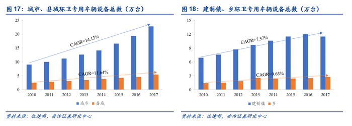 城乡环卫一体化加速,未来乡镇环卫市场空间不可小觑。除了城市和县城的环卫市场在扩容以外,乡镇农村的增长也不可小觑。近年来,建制镇在环卫专用设备需求数量上高于县城水平且增长迅速。随着乡镇生活水平的不断提高带来居民对居住环境要求的提高,乡镇环卫市场未来有较大的发展潜力。乡镇环卫项目主要形式是和城市环卫项目一起打包形成城乡环卫一体化项目,环卫企业以县城为锚地进而辐射周边乡镇,从而形成环卫一体化。
