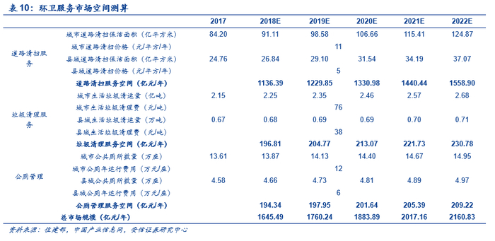 2022年环卫服务市场空间超2000亿元/年。根据《2017年城乡建设统计年鉴》,2010-2017年城市公共厕所数量由11.93提高至13.61万座,CAGR=1.9%,县城公共厕所数量由4.08提高至4.58万座,CAGR=1.7%,由此推算2018-2022年公共厕所数量。根据中国产业信息网,我国公厕的年运营费用在12万元/座左右(本文取12万元/座),县城价格不到城市维护单价的一半(本文取6万元/座)。由此可得,至2022年,我国公厕管理服务市场空间为209.2亿元/年。综上,至2022年,我国环卫服务市场空间约为2160.8亿元/年。
