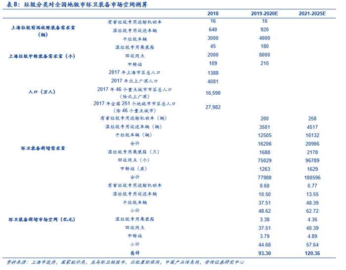 简单测算,假设人口数量与垃圾产生量及配套环卫设备呈正相关。根据上海市三年行动计划的设备要求,按照人口比例将环卫设备需求量推广至46个重点城市及全国251个地级市(扣除46个重点城市)。由于垃圾产生量和清运量受经济发展水平的影响,加之上海推行垃圾分类的强大力度,因此在测算其他城市垃圾产生量及配套环卫设备,我们将除北上广深外其他城市所需新增配套环卫设备数量乘以80%来对区域经济发展水平和配套环卫水平的影响进行调整。