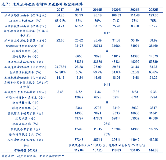 不考虑垃圾分类的话,从新增市场规模来看,2018-2020年全国新增环卫设备市场规模达618亿元。根据《城乡建设统计年鉴》相关数据,测算得出2018-2022年城市环卫车辆总需求量为21.96万台,2018-2022年县城环卫车辆总需求量为5.50万台。根据立木信息咨询数据,环卫设备中25%为垃圾设备,75%为道路清洁设备,垃圾设备均价为15万元/台,道路清洁设备为25万元/台。据此预测,垃圾设备需求量为6.86万台,道路清洁设备需求量为20.59万台,测算得出2018-2022年新增环卫设备需求为618亿元。