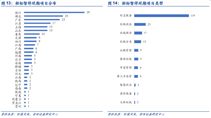 环卫企业新项目短期拓展或受复工影响,全年进度基本可控。受疫情及年假延期复工影响,节后各地政府采购网纷纷发布环卫项目标延期或暂停公告。据环境司南的统计,1月27日-31日期间,全国共有217个环卫项目招标延期或暂停,具体见下图。对做环保工程项目类企业,一季度的疫情将延长现有工程施工时间,对后续的项目安排将产生一定影响。但一般来说工程类公司一季度均是招投标淡季,随着疫情得到控制,开工和新签订单或将反弹。