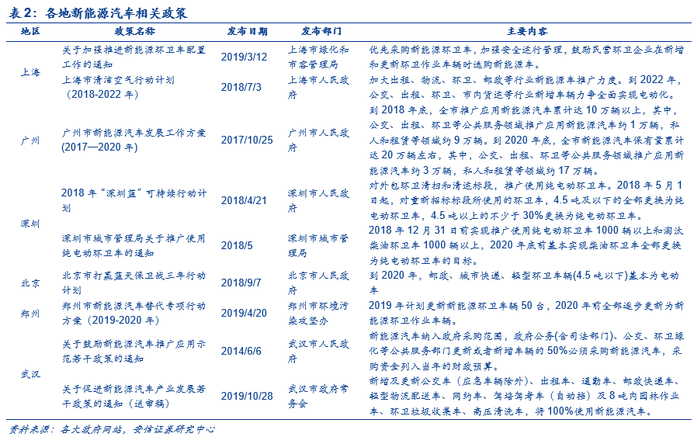 近年来,新能源汽车相关政策相继推出,促进新能源环卫车的发展。2013年9月,财政部等四部委印发《关于继续开展新能源汽车推广应用工作的通知》,要求新增或更新的公交、公务、物流、环卫车辆中新能源汽车比例不低于30%。2018年,《打赢蓝天保卫战三年行动计划》指出,加快推进城市建成区新增和更新的公交、环卫、邮政、出租、通勤、轻型物流配送车辆使用新能源或清洁能源汽车。