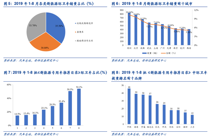 2019年新能源环卫车销量大幅增长,一二线城市需求集中度高。根据汽车总站数据,截至2019年8月,我国新能源专用车销量3.36万辆,同比增长29.4%,其中,新能源环卫车累计销售8062量,同比增长70.6%。将新能源环卫车按用途分类可分为垃圾收集转运车、粪便车和路面保洁作业车,三者销量分别为2862、2483、2717辆,占比分别为35.5%、30.8%、33.7%。从销售区域来看,一二线大城市为新能源环卫车的重点需求城市,前十名城市累计销售5716辆,占比达70.9%。