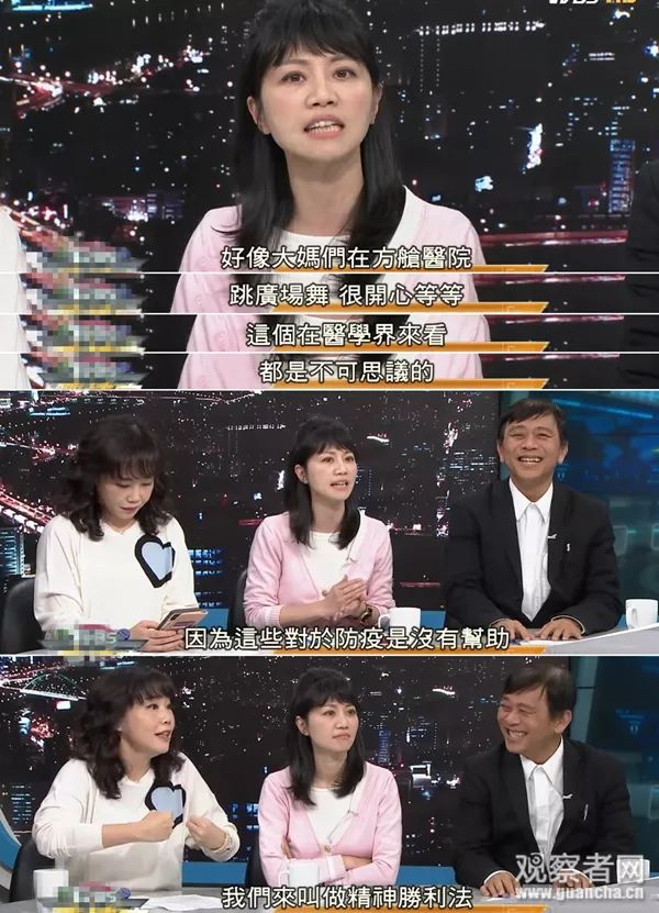 近日大火的“方舱医院广场舞”竟也成了节目中的主要攻击对象,台“立法委员”高嘉瑜无端指责称病患们在院内跳广场舞是“面子工程”,无利于养病恢复。媒体人尹乃菁更在一旁附和,称此为“精神胜利法”。