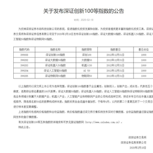 2月18日,深交所发布深证创新100等五大指数,涵盖科技创新宽基指数以及科技细分行业指数。具体看包括深证创新100指数(深创100)、深证大数据50指数(大数据50)、深证机器人50指数(机器人50)、深证人工智能50指数(AI50)和深证物联网50指数(物联网50)。
