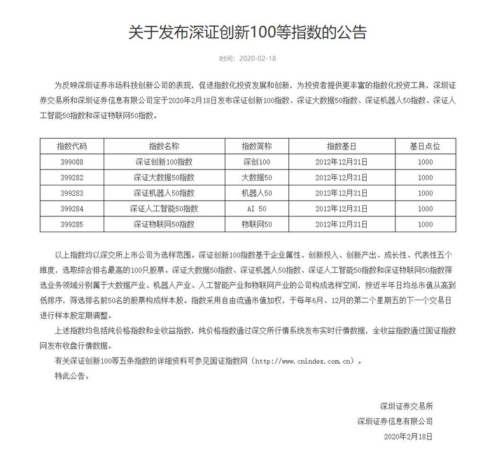 深交所表示,以上指数均以深交所上市公司为选样范围。深证创新100指数基于企业属性、创新投入、创新产出、成长性、代表性五个维度,选取综合排名最高的100只股票。深证大数据50指数、深证机器人50指数、深证人工智能50指数和深证物联网50指数筛选业务领域分别属于大数据产业、机器人产业、人工智能产业和物联网产业的公司构成选样空间,按近半年日均总市值从高到低排序,筛选排名前50名的股票构成样本股。指数采用自由流通市值加权,于每年6月、12月的第二个星期五的下一个交易日进行样本股定期调整。