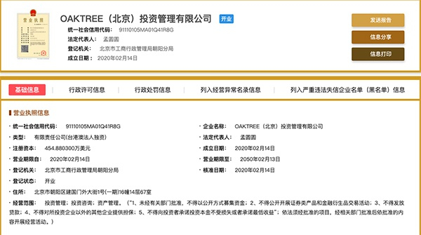 国家企业信息公示系统显示,OAKTREE(北京)投资管理有限公司注册资本454.8803万美元,法定代表人为孟圆圆,经营范围包括投资管理、投资咨询、资产管理。该公司由橡树资本(香港)有限公司,即OAKTREE CAPTRIAL(HONG KONG)LIMLTED100%持股。