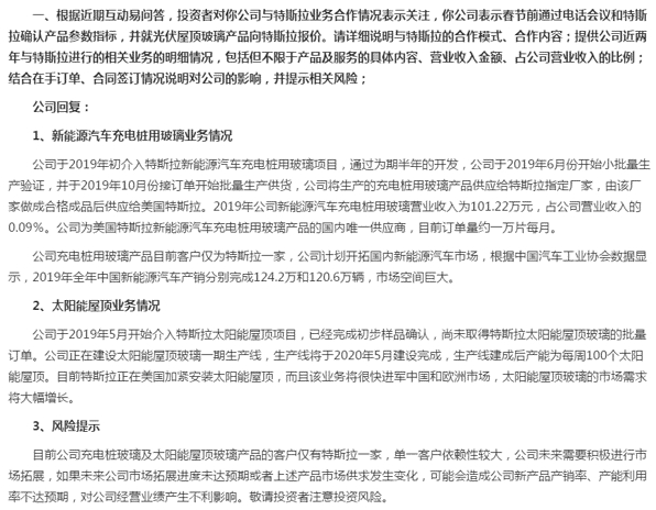 秀强股份表示,公司于2019年初介入特斯拉新能源汽车充电桩用玻璃项目。公司为美国特斯拉新能源汽车充电桩用玻璃产品的国内唯一供应商,目前订单量约一万片每月。公司于2019年5月开始介入特斯拉太阳能屋顶项目,已经完成初步样品确认。