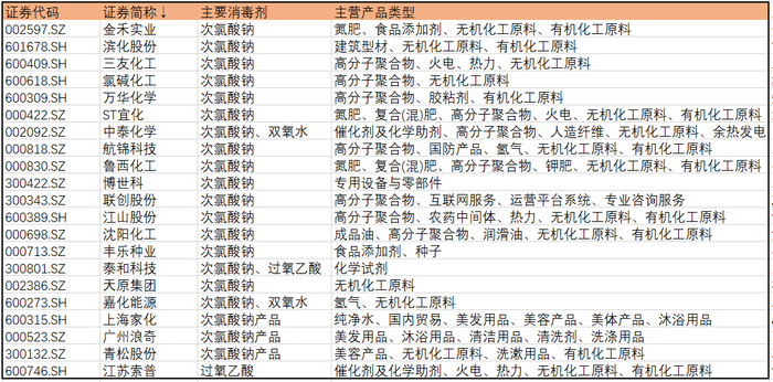 那么,A股市场范围内,有哪些上市公司的业务是消毒类化学品?不同的化学原料分别对应哪些终端消毒剂?
