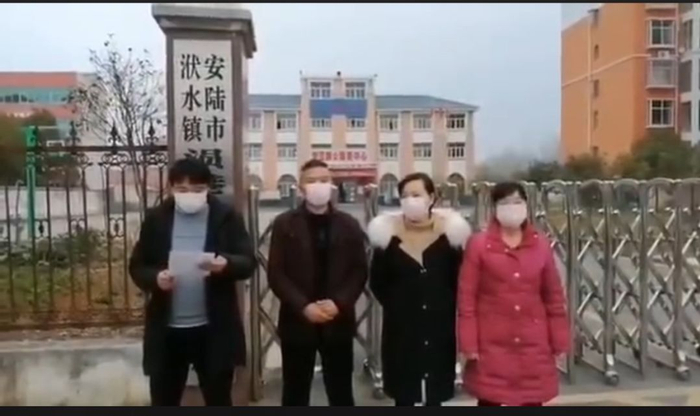 从博主@北京人不知道的北京事儿 发布的视频可以看到,有四个带着口罩的人在背景为“安陆市洑水镇涢”字样的牌子前一起念道:“我们是一家四口,今天下午在家打扑克,违反了非常时期不聚集、不打牌的命令,我们错了。”