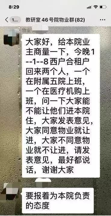 除了租户,奋战在一线的工作人员也遭到了“特殊对待”。此前,一张“某小区业主群里物业人员让业主举手表决不让医务人员进入小区”的聊天截图引发舆论热议。2月9日,郑州市防控办核实网传截图属实。