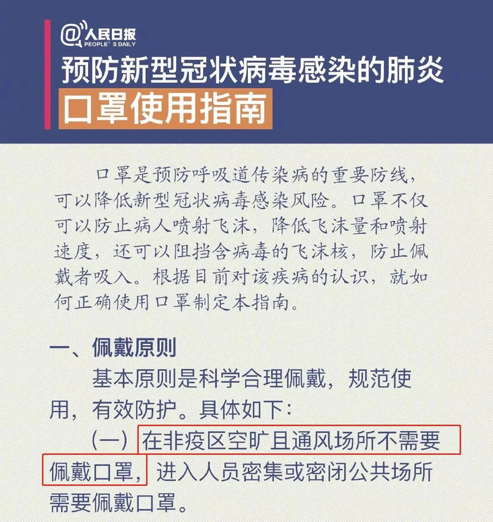 在《人民日报》发布的预防新冠肺炎的“口罩使用指南”中提到,在非疫区空旷且通风场所,不需要佩戴口罩。