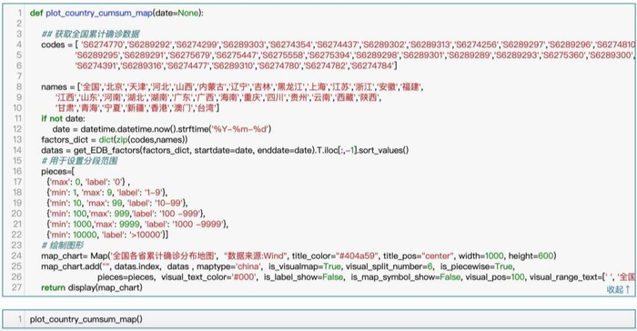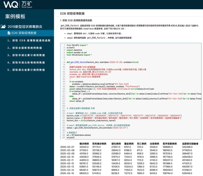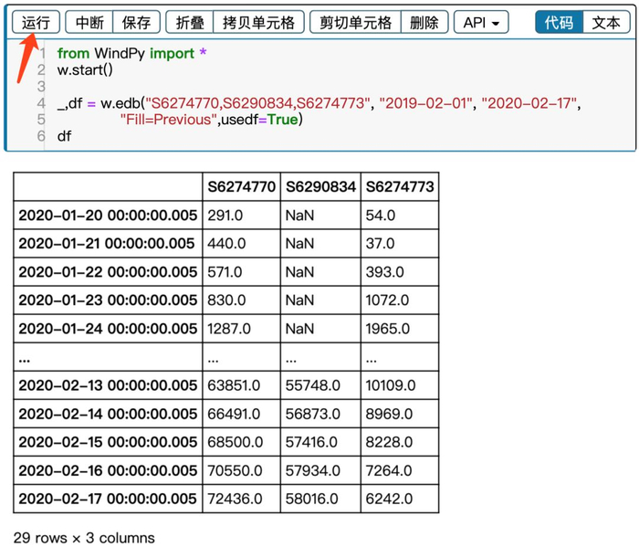 导入WindPy库,并将代码复制至notebook单元格中后,点击运行,即可输出疫情数据: