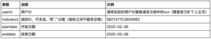 https://www.windquant.com/qntcloud/data/edb?userid=xxx&indicators=S6274770,S6290834&startdate=2020-02-06&enddate=2020-02-08