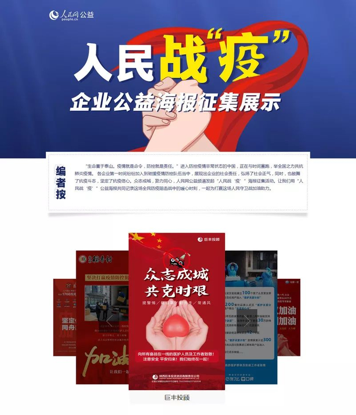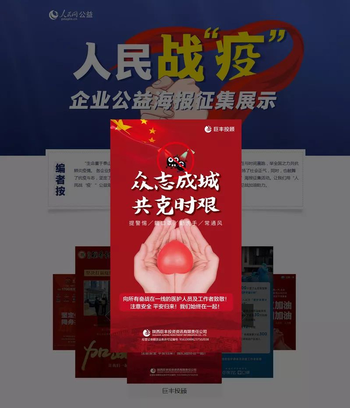 近日,陕西巨丰投资资讯有限责任公司(简称:巨丰投顾)抗疫海报入选由人民网公益频道发起的人民战“疫”企业公益海报征集展示活动,同时入围此次活动的还包括中国工商银行、中国建设银行、北汽集团、中国一汽等企业。