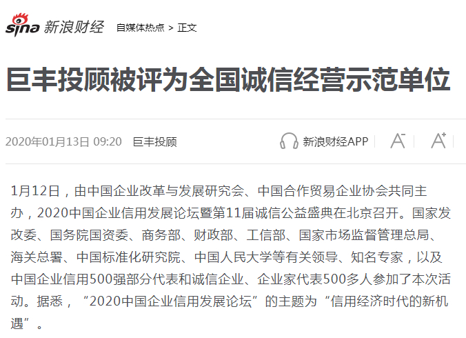 1月12日,由中国企业改革与发展研究会、中国合作贸易企业协会共同主办,2020中国企业信用发展论坛暨第11届诚信公益盛典在北京召开。巨丰投顾被评为“全国诚信经营示范单位”。