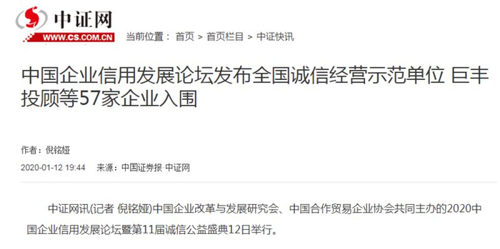 巨丰投顾被评为“全国诚信经营示范单位”,该事件被中国证券报-中证网、新浪财经等等权威媒体报道。