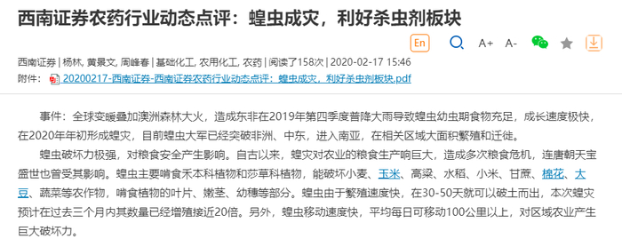 多家券商、期货公司纷纷拿出研报分析称,若蝗虫灾害继续在全球蔓延,将推高全球农产品价格,国内农业板块上市公司或将受益,对消灭蝗虫的农药类企业也将形成利好。国金证券认为,近日,非洲沙漠蝗虫灾害蔓延,预计未来非洲蝗虫灾害或将从缅甸穿入我国云南境内,治理蝗虫灾害主要方法是农药治理,2014年联合国粮农组织发布蝗虫化学杀虫剂:其中杀灭沙漠蝗虫为:噁虫威、毒死蜱、溴氰菊酯、除虫脲、杀螟硫磷、氟虫腈、功夫菊酯、马拉硫磷、伏虫隆、杀虫脲,短期内相关的农药品种需求量将有一定的增长。
