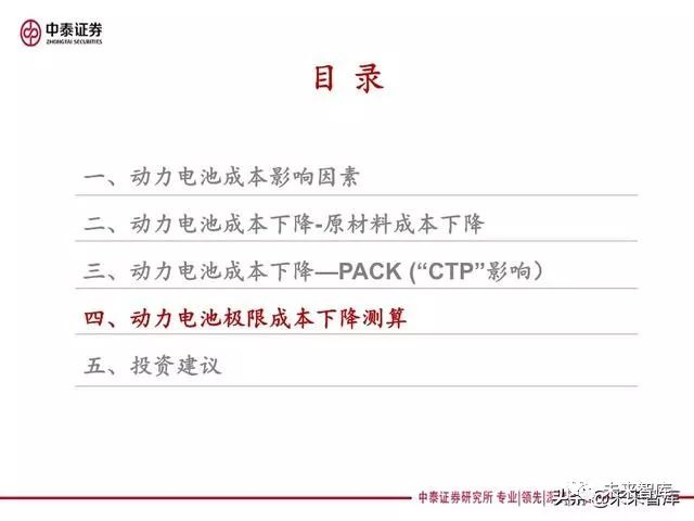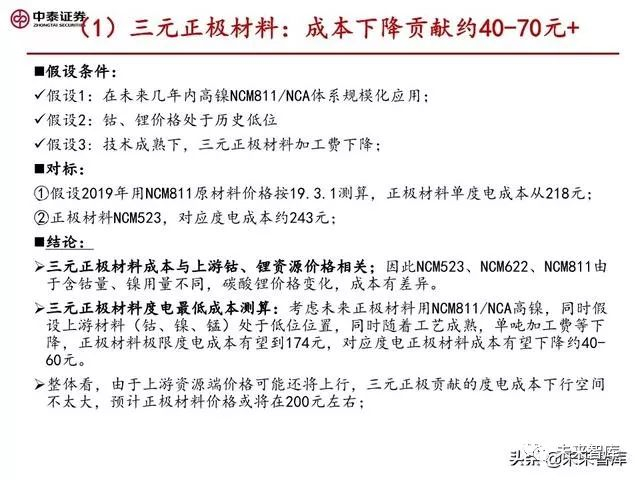 报告亮点:找出锂电池降本核心要 素,并分别讨论各大锂电池材料价格可能的极限下降空间,同时分析CTP(无模组)降本 效果;