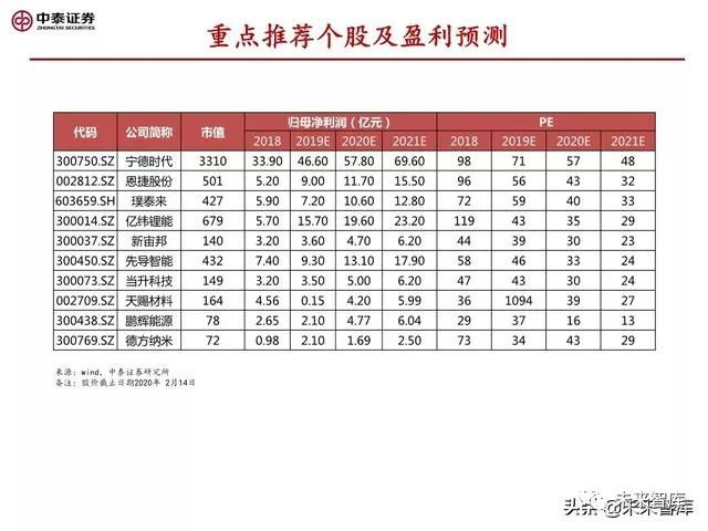 锂电池龙头: 1)原材料成本能力:原材料端构建完备供应链体系(核心关键环节自主生 产如正极),构建循环经济产业链的公司具备原材料采购成本优势;2)研发技术领先:通 过技术创新实现技术降本,同时凭借高品质、高可靠性、高性价比产品占据全球电动车主 要份额;重点推荐宁德时代、比亚迪、亿纬锂能等;