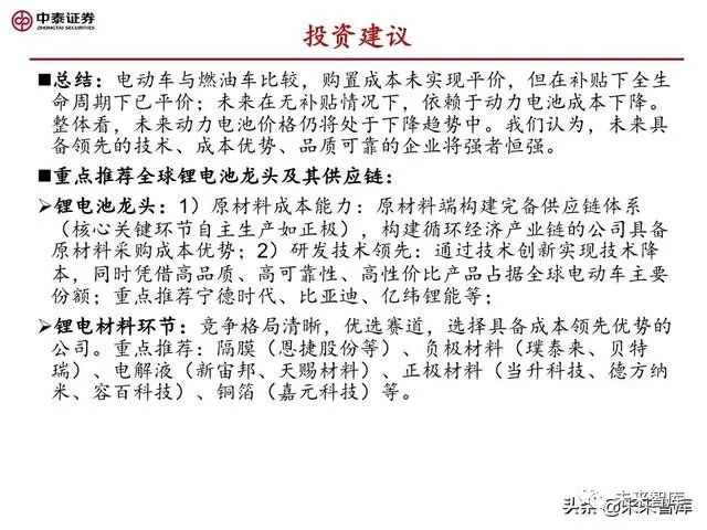 电动车已实现补贴下全生命周期平价,未来在无补贴情况下,依赖于动力电池 成本下降。整体看,未来动力电池价格仍将处于下降趋势中,具备成本优势的企业,将在 全球电动化竞争中脱颖而出。重点推荐具备成本优势的锂电池龙头及锂电材料公司: