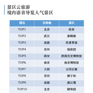 此次免费开放语音导览的境内景区覆盖了国内多个省份,其中北京、苏州、上海、杭州、南京、重庆、西安、成都和广州的景区最多,北京有100多家景区的语音导览均免费开放。故宫、黄鹤楼、杜甫草堂等,是人气最高的十大境内语音导览景区。