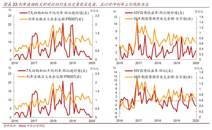 当前利率衍生品的参与主体以金融机构为主,但企业也可以参与到这些衍生品市场中。对于利率互换而言,非金融机构只能与具有做市商或结算代理业务资格的金融机构进行以套期保值为目的的利率互换交易,即企业的需求必须基于套保为目的。对于国债期货而言,对法人主体的限制相对较少,企业即可以做多也可以做空,但需要满足遵循的持仓限额。而监管机构对企业开展衍生品业务的规章制度上,也是向套保需求引导。2020年1月20日,国务院国资委印发《关于切实加强金融衍生业务管理有关事项的通知》,对原有金融衍生业务监管制度进行了整合、修订,要求央企参与金融衍生业务需要落实监管责任、严守套保原则、有效管控风险、规范业务操作、强化监督检查、建立报告制度。其中对于严守套保原则方面,要求央企开展金融衍生业务要严守套期保值原则,以降低实货风险敞口为目的,与实货的品种、规模、方向、期限相匹配,与企业资金实力、交易处理能力相适应,不得开展任何形式的投机交易。货币类衍生业务的规模、期限等应当在资金需求合同范围内,原则上应当与资金需求合同一一对应。整体而言,企业如果只是套保需求,当前利率衍生品市场可以满足,但如果企业想进行套利操作,则相对仍有障碍。对于中小金融机构,也面临同样问题。利率互换方面,不具有做市商或结算代理业务资格的其他金融机构可以与所有金融机构进行利率互换交易,但不能与非金融机构进行利率互换交易。国债期货方面,银行和保险自营资金尚未被放行入市。交易中心数据显示,截至2020年2月17日,具有做市商资格的金融机构合计30家,尝试做市机构55家,截至2017年7月5日,具有结算代理业务资格的机构合计49家。因此针对企业和中小金融机构而言,大的金融机构或有资格参与到利率衍生品市场的金融机构,可以开发相应的产品来配合这些企业、中小金融机构参与进来。对开发相关产品的大金融机构而言,可以形成新的盈利收入点,而对于企业而言,可以使其不再局限于套保,还可以享受买入产品获取的套利收益。从利率互换和国债期货月度成交看,投资者的交易需求会跟随利率波动增加而增加,当标的利率变动加大时,对应利率衍生品的成交也会放量,而当标的利率或标的资产价格变动较小时,衍生品需求会走弱。同时这种随价格波动而波动的交易需求也呈现一定的非对称性,即利率上行时的交易需求要明显强于利率下行时的交易需求,表明当前投资者利用利率衍生品仍以套保为主。
