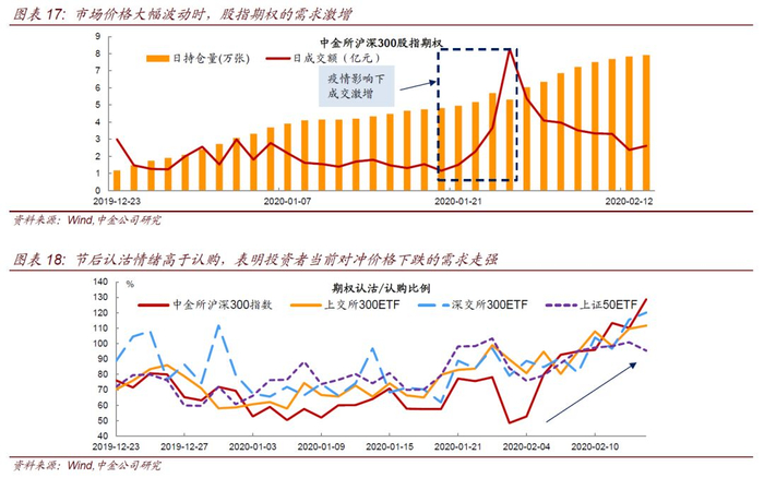 沪深300ETF和股指期权上市将为投资者提供更丰富的投资策略。期权非线性的收益特征使得其相比于现货和期货,将为投资者提供更广阔的策略构建空间:除了方向性交易外,投资者可以利用期权进行多元化的风险对冲;利用不同类型、期限和行权价的合约构建不同收益特征的组合,在方向性、波动率以及时间上进行交易。以套保需求为例,冠状疫情爆发后,股票股指期权的成交明显放量,以中金所沪深300股指期权为例,其日成交额攀升明显,表明在股票市场价格大幅波动环境下,投资者对期权类品种的套保需求增加。从期权的认沽/认购比看,可以看到节后投资者认沽情绪明显强于认购,反映出投资者当前对股市下跌风险保护(对冲)的需求提升。