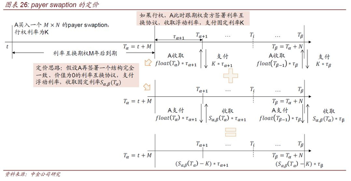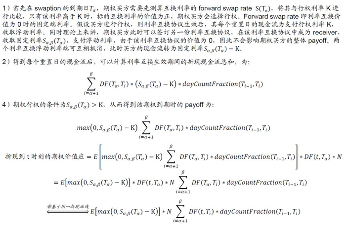 定价方面,利率互换期权折现后的payff可以基于标的利率互换在第一个重置日的价值进行展开,以到期日为、标的利率互换协议到期日为(即利率互换协议的期限为)的payer swaption为例: