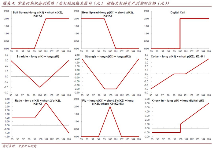 此外,期权的非线性结构也带来了更多的套利组合。不同线性结构产品组合后,其盈利曲线仍是线性,但对于期权的非线性盈利曲线而言,可以同时调节期权的数量、看涨还是看跌、买入还是卖出、行权的价格,对应也会衍生出格式各样的套利组合,极大丰富了套利者的需求。