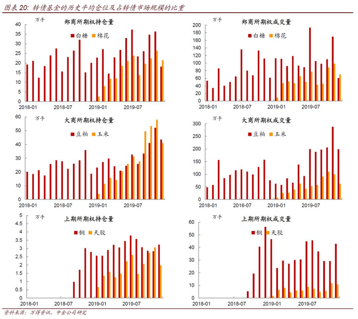 2019年,我国商品期权市场快速扩容,交易量和持仓量都迅速增长。按单边计算,截至2019年年末,豆粕期权、玉米期权、棉花期权和白糖期权持仓排名靠前,分别为43.5万手、31万手、21.4万手和18.1万手,对应月均成交量分别为148万手、56万手、58万手和113万手。早期上市的商品期权中,豆粕期权、白糖期权和铜期权2019年年末持仓量分别为44万手、18万手和3万手,各较2018年年末增加25万手、减少2万手、增加0.4万手;同时对应2019年月均成交量分别为148万手、113万手、35万手,较2018年各增加44万手、36万手和4万手。随着交易所制度不断的改善,投资者参与度也明显提升,2019年5月底,郑商所实施了新的交易者适当性制度,客户期权交易权限开通效率明显提升,开通数量迅速增长,也带动了期权成交活跃度提升。