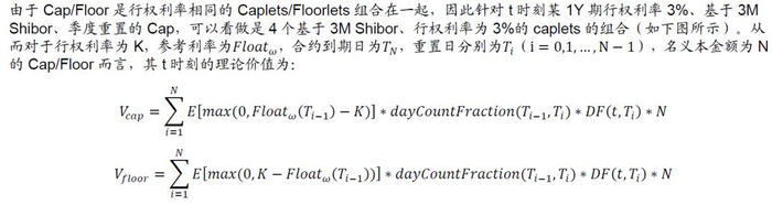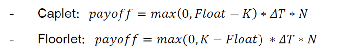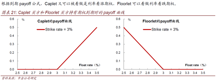 利率上限期权(Caplet、Cap)和利率下限期权(Floorlet、Floor)的标的资产为单一利率,通常为一些常见的市场利率,比如3M Libor等。Caplet的卖方保证买方可以在一定时期内获得一个行权利率(Strike rate),同时买方付给卖方一定的期权费,如果在结算日参考利率(合约标的利率)高于该行权利率,则期权买方有权利执行期权买入该标的利率,即期权卖方需要将合约标的利率与上限期权行权利率之间的利差支付给买方。Floorlet则与上限期权相近,卖方同样保证买方一个行权利率,若结算日参考利率低于该行权利率,则期权买方有权利行权,期权卖方需要向买方支付参考利率不足行权利率部分的利差。Caplet和Floorlet都是欧式期权,假设参考利率为Float,对于期权买方而言,其到期时payoff公式对应分别为:(K为行权利率,ΔT为计息期限,N为名义本金额)