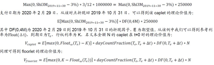 对于caplet和floorlet的定价,可以基于一个实例展开。以caplet为例,假设2019年10月31日A买入了一个基于3M Shibor(记为Shi3M)的caplet,到期日为1个月后,即2019年11月30日,行权利率strike rate = 3%,名义本金额100万元。假设到期日当天,3M Shibor为3.02%,超过行权利率,A选择行权,在2019年11月30日可以明确的payoff为,这笔利息的支付实际会发生在2020年2月29日,相当于2019年11月30日起A从卖方B处获取0.02%的利差,期限为3个月(因参考利率为3M Shibor,如果为6M Shibor,则对应利差期限为6个月)。在真实情形下,我们无法在2019年10月31日的时点提前预知11月30日3M Shibor是否会超过3%,因此实际上11月30日A可以明确的payoff为: