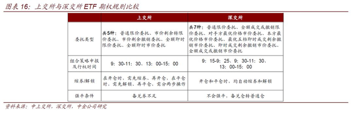 沪市ETF期权业务已平稳运行超过4年,其规则已被投资者广泛熟知。去年深市发布的ETF期权交易规则(征求意见稿)借鉴了沪市经验,与其规则内容基本保持一致,仅有较小的差异。一是合约标的,上交所标的规模略大、活跃度略高。二是委托类型,深市交易指令有7种,与沪市相比略为丰富。三是备兑开仓锁券或解锁方式改进,深市备兑开仓平仓更加简便,在保证金充足的情况下,深市不易触发强平;四是组合策略申报时间拉长,深市在集合竞价阶段可以申报组合,申报时间段更长,资金使用效率更高。