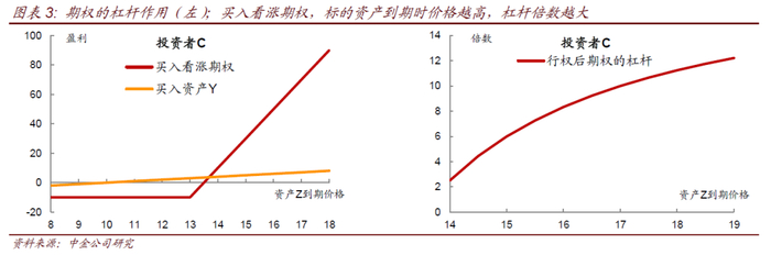 对于投机者而言,期权可以提供杠杆效应。假设投机者C认为资产Z在今后三个月内会涨价,Z当前价格为10元,同时期权市场上,行权价为13元,期限为三个月的基于该资产的看涨期权当前价格为0.5元。投资者此时即可以直接买入资产Z,也可以买入该看涨期权,如果投机者C判断对了方向,三个月后Z的价格上涨至15元,两种方式都将为投资者带来盈利。假设投资者本金为10元,投资者直接买入该资产的盈利为元,买入看涨期权的盈利为元,买入期权的投机策略盈利为直接买入资产Y的6倍。但如果投资者判断错误了价格变动方向,期权策略也会触发更大损失。