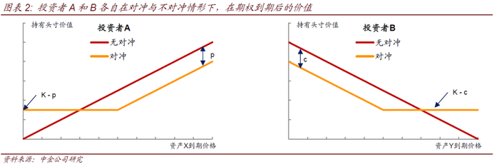 对于对冲者(套保方)而言,通过买入看涨/看跌期权可以对冲资产价格上涨/下跌的风险。假设对冲者A当前拥有某资产X,当前价格为S,A担心两个月后X的价格会下跌,所以想买入保护。此时A可以在期权市场买入以资产X为合约标的看跌期权,期权执行价格为K,到期日为两个月后。持有该期权可使A在两个月后以K价格卖出资产X,期权费为p。如果两个月后资产X的市场价格低于K,投资者选择行权,考虑到期权费后,实际收入Kp;如果资产X的市场价格高于K,则投资者放弃行权,期权到期时价值为0,但拥有资产X的实际收入是高于Kp的。再假设对冲者B当前持有某资产Y的空头头寸,B担心一个月后资产Y的价格会上涨,此时B可以在期权市场买入以资产Y为合约标的的看涨期权,期权执行价格为K,到期日为一个月后,持有该期权可使B在一个月后以K价格买入资产Y,期权费为c。如果一个月后资产Y的市场价格高于K,投资者选择行权,考虑到期权费后,实际收入为Kc,如果Y的市场价格低于K则放弃行权,期权到期时价值为0,但由于持有Y的空头,实际收入高于Kc。