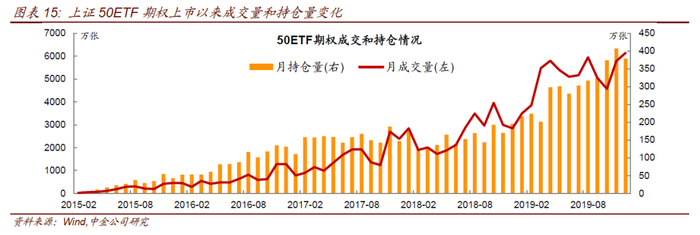 作为A股市场首个场内权益类期权品种,上证50ETF期权自上市以来发展稳健,成交、持仓稳步上升,已成为全球主要的ETF期权品种之一。2019年,上证50ETF期权合约全年累计成交6.18亿张,日均成交253.3万张,年末持仓379.1万张,日均持仓342万张,累计成交面值17.7万亿元,累计权利金成交3359.12亿元。投资者人数稳步增加,年末期权投资者账户总数达41.33万。经过近5年的ETF期权发展之路,我国期权市场规则体系更加成熟,投资者参与度提升,为后续更多挂股票股指期权入市奠定了基础。