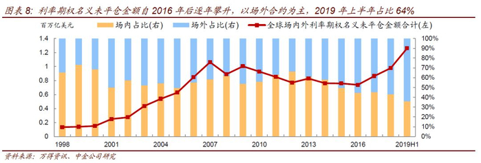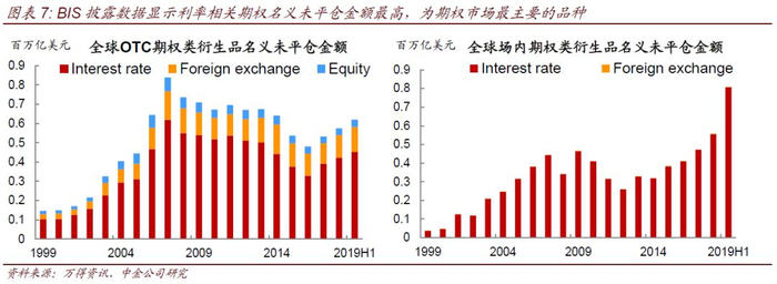 场内外期权合计来看,利率期权是主要的期权品种之一。截至2019年上半年,全球场外和场内利率期权名义未平仓金额分别为45.30万亿美元和80.75万亿美元,合计126.05万亿美元,占全球期权类衍生品比例为87.8%。