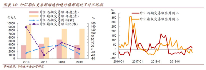相比于成熟资本市场,我国期权市场发展起步较晚,当前场内成交活跃度较高的品种以股票期权和商品期权为主,利率期权目前仍在起步阶段;场外而言则是外汇期权为主。外汇期权的成交以银行间批发市场为主,期限多集中在短期,套保属性强,且相比外汇远期而言成本更低,2018年以来增速超过外汇远期。2019年银行间外汇市场全年期权交易为8500亿美元,其中对客市场占比31.6%,银行间市场占比68.4%。股票股指期权于2015年起步(上证50ETF期权),后快速发展。2019年上证50ETF期权合约全年累计成交6.18亿张,年末持仓379.1万张,累计成交面值17.7万亿元。同时2019年11月证监会宣布启动扩大股票股指期权试点工作,将按程序批准上交所、深交所上市沪深300ETF期权,中金所上市沪深300股指期权,标志着场内交易衍生市场发展进入一个新阶段。股票股指期权的交易规则也在向更简便、更完备的方向发展,沪深300ETF和股指期权上市将为投资者提供更丰富的投资策略。商品期权始于2017年,豆粕期权挂牌上市标志着首只场内商品期权诞生,近几年快速发展下,场内商品期权已扩充到11只。商品期权的推出进一步丰富了投资者和企业对大宗商品的套保需求。从商品期权的发展来看,监管机构目前对于已经具有期货品种的商品,去开发相应的期货期权品种持更开放态度。所以随着期货本身品种的增加和成熟,未来也会有更多商品场内期权的推出。从海外市场经验看,对于商品期权和国债期权而言,一般都是先开发期货品种,然后开发期权品种。按照这个经验,未来中金所的利率期货和期权可能也会参照这个模式。
