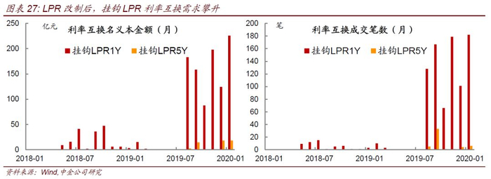 交易中心推出挂钩LPR利率相关期权标志着利率市场化改革更进一步。2019年8月央行调整并完善LPR形成机制,改制后可以看到挂钩LPR的利率互换名义本金额逐月走高,每月的成交笔数也要高于LPR改制前,反映了金融机构(尤其是银行)对LPR相关衍生品的需求明显提升。