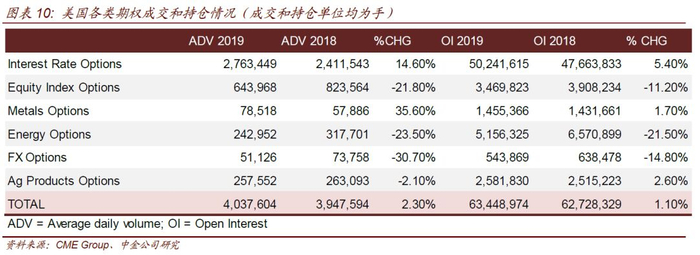 就美国市场而言,利率期权的成交和持仓情况明显高于其他期权品种。2019年利率期权的日均成交量为276万手,同比增长14.6%,占各期权品种合计比例为68.4%,年末持仓量5024万手,同比增长5.4%,占比79.2%。