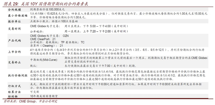 国债期货期权的合约月份通常分两种,序列月份期权月份和季月期权合约,前者行权将得到最近的季月期货合约,后者行权将得到对应月份的期货合约。以CME上市的10年期美债期权合约为例(10-Year T-Note Option),上市合约为4个连续月份合约(包括3个序列月份合约和1个季月合约)加上2个季月合约(3月、6月、9月、12月)。身为最典型的场内利率期权品种,国债期货期权合约通常为标准化合约,交易所会对合约规模、最小价格波幅、报价单位、交易时间、产品代码、上市合约、交易终止、头寸限制、交易规则、价格限制、执行价格间距、行权方式、结算方法、标的物等都有明确规定。合约单位是指每交易单位期权对应标的物的数量,海外市场上的国债期货期权合约单位通常设置为1手期权对应1手期货,例如10年期美债期权合约和10年期美债期货合约的到期票面价值均为10万美元。期权最小价格波幅指的是期权权利金(期权费)的最小变动单位,即期权合约价格涨跌波动的最小值,其设置通常与标的期货最小变动价位相等,或为标的期货最小变动价位的二分之一。国债期货期权合约的行权价格往往不止1个,交易所往往先计算根据标的国债期货价格计算出ATM期权合约对应的行权价,再按照行权价格间距在ATM期权合约两侧各推出等数量的ITM期权和OTM期权合约。行权价格间距指的是具有相同标的期货合约且同一类型的期权合约中,相邻两个项圈价格之间的差。行权价格数量和行权价格间距的设计使期权可以较全的覆盖标的期货数日内的波动,可以确保现券市场价格出现剧烈波动时,投资者仍能找到满足自身需求的实值、平值和虚值期权进行交易。国债期货期权日内交易时间上也往往与标的期货相同。