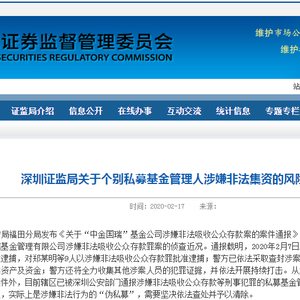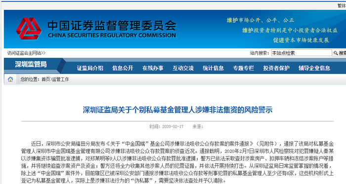 近日,深圳证监局公布了一份关于个别私募基金管理人涉嫌非法集资的风险警示。公告显示,深圳市公安局福田分局在《关于“中金国瑞”基金公司涉嫌非法吸收公众存款案的案件通报》中,对私募基金管理人——深圳市中金国瑞基金管理有限公司(简称“中金国瑞”)涉嫌非法吸收公众存款罪案侦查近况进行通报。