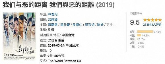 在《我们与恶的距离》中,有着日韩美剧精品的“现实气质”经由悲伤的故事展露无遗,观众备受前所未有的震撼,突然发现除了偶像剧,台剧原来还可以拍出这样特别的作品。《我们与恶的距离》最后以9.5分的评分,成为豆瓣2019榜单中评分最高的华语电视剧集,成为谈论2019年华语剧时无法忽略的一部作品。