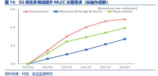 5G的推进将在多领域提升MLCC的长期需求。根据村田的数据,预计2024年智能手机领域的MLCC需求量将是2019年的约1.5倍(未来5年CAGR 8.5%);预计服务器领域2024年的需求量是2019年的1.4倍(未来5年CAGR 7%);基站端2024年的需求量超过2019年的1.2倍(未来5年CAGR 4%)。