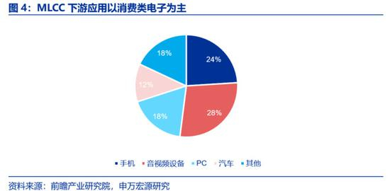 MLCC下游较分散,应用以手机、PC、音视频等泛消费电子为主。MLCC下游应用主要包括手机(24%)、音视频设备(28%)、PC(18%)、和汽车(12%)、和其他包括工业和医疗等领域。其中消费电子类的占比约为总市场的70%。