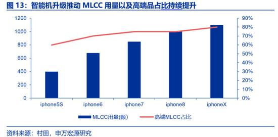 智能手机升级推动对小型化MLCC需求加速。智能手机在前后多摄、屏幕指纹、全面屏、线性马达、3D sensing等创新功能上的持续升级,加速了其对MLCC的需求量。同时在手机内部功能复杂度和集成度不断提升的情况下,对于高端小型化、大容量产品的需求尤为强烈。从iphone中MLCC的用量来看,iphone5S单机用量约400颗,iphoneX中的用量达到1100颗,且高端小型化MLCC的占比持续提升。