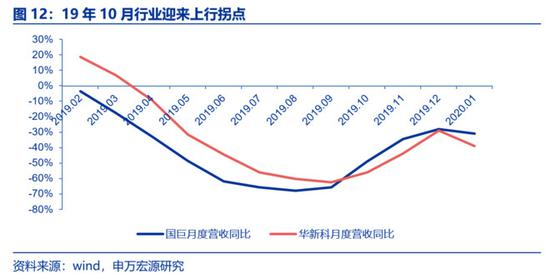 行业进入补库存周期,上行拐点已现。这一轮补库存的核心逻辑是在19Q4进入旺季效应之下,渠道商对于高端计算机、服务器和智能机所需的0402和0201规格的MLCC产品进行补货,导致厂商供应紧张。0402、0201等104、105规格主要用在手机上,因供需缺口较大,引导MLCC制造商将产能转进手机料,产能排挤效应之下导致0402以上规格,包含0603、0805等大尺寸MLCC交期也开始延长。从2019年12月底至今,中大尺寸MLCC平均涨幅在20%-30%,小尺寸平均涨幅在10%-20%。从国巨、华新科的月度营收同比数据也可以看出,自19年10月份起,行业迎来明显的上行拐点。