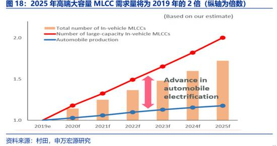 村田预测2025年车用MLCC市场需求量将是2019年的约1.7倍,其中高端大容量MLCC需求量为19年的2倍。在新能源汽车和汽车电子化率不断提升的背景下,车用MLCC市场将迎来爆发,而高端MLCC增量更将显著高于整体水平,汽车电子将是未来MLCC最大的增量市场。依照村田的数据测算,2025年整体汽车MLCC需求量将超7000亿颗。