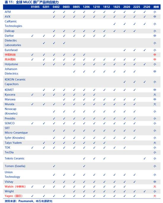 行业供给格局重塑,大陆企业将持续承接退出产能,成为常规品的主力,且在小型化领域取得一定突破。不考虑产能退出因素,从全球各大MLCC原厂的产品供应能力来看,超小型和超大型尺寸的供应商较为稀缺,而各家均具备常规型尺寸的供应能力。因此之前常规品的竞争较为激烈。随着日韩厂商持续大举退出常规品的供给,具备大规模供应能力的厂商将率先承接此部分产能。因此以国巨、华新科为代表的台系龙头最为受益。而以风华高科为代表的大陆企业凭借全产品线的供应能力、本地化服务优势以及中等的产能规模也将充分受益于客户的转单效应。同时大陆龙头企业亦具备小型化0201产品的规模化供应能力,将享受到智能手机和消费电子带来的MLCC需求红利。